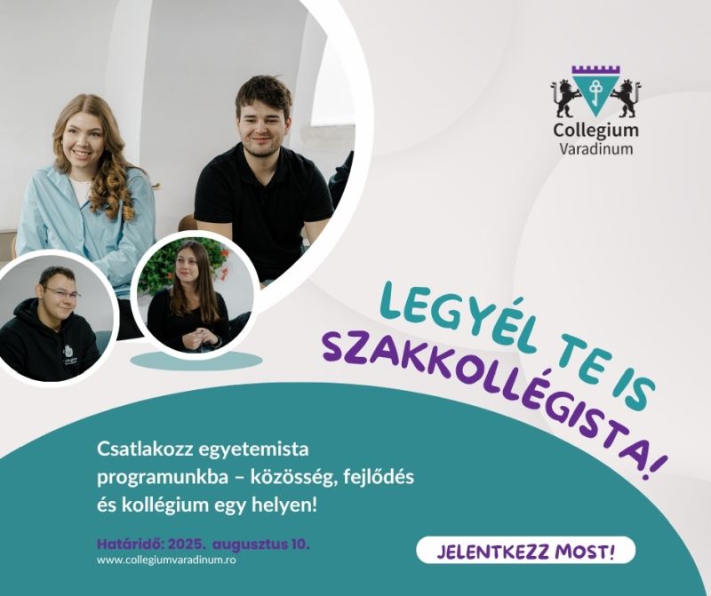A Collegium Varadinum effajta igényekre és kérdésekre igyekszik reagálni – szakmai, szellemi és közösségi pólusokon egyaránt! Ennek függvényében hirdette meg az idei, 2025-ös felvételijét a következő tanévre is, és olyan egyetemi hallgatók jelentkezését várja augusztus 10-ig, akik elkötelezettek személyes és szakmai fejlődésük iránt, valamint szívesen csatlakoznának egy aktív, támogató és befogadó közösséghez Nagyvárad szívében.